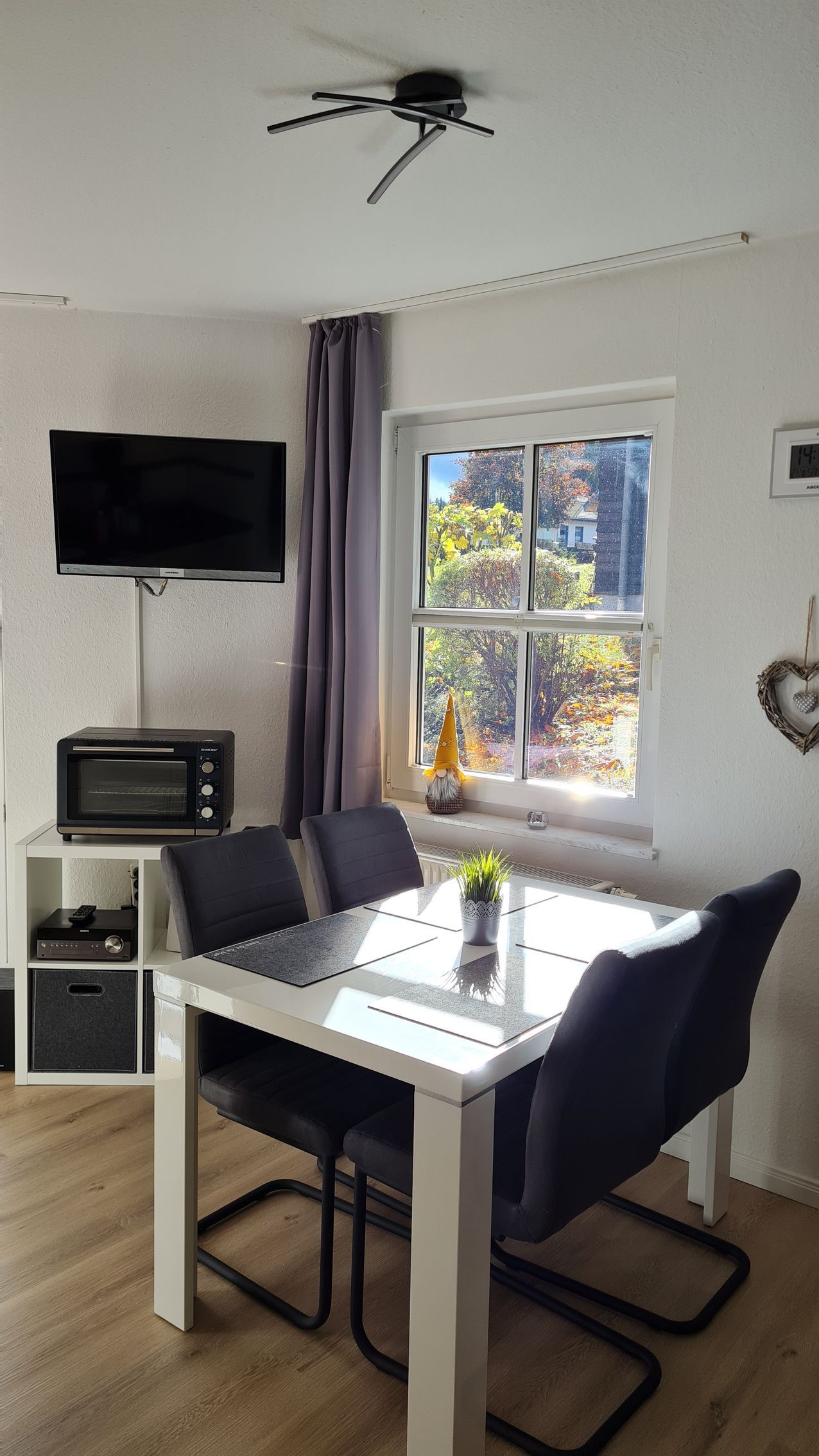 Ein Smart-TV und eine DAB+ Stereoanlage laden hier zum entspannen ein. Der Essbereich ist mit einem Tisch und 4 gemütlichen Stühlen ausgestattet.